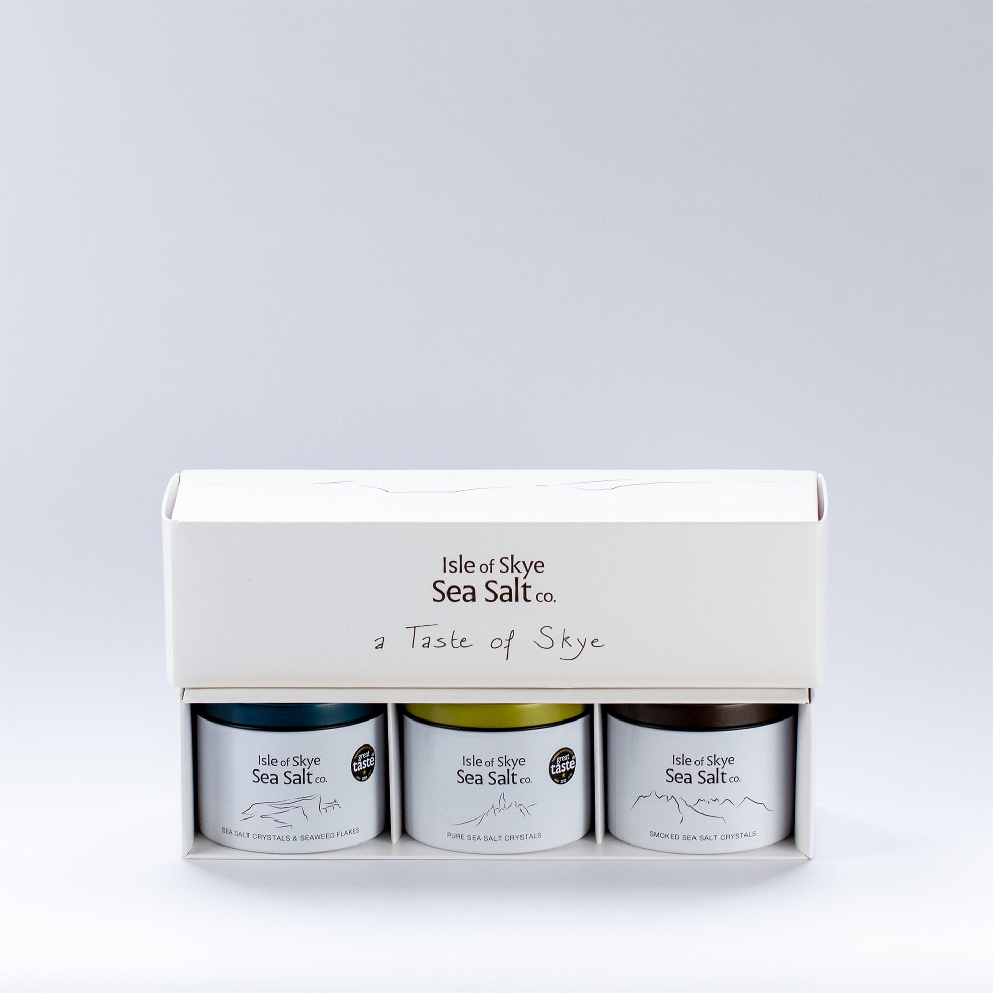 Ce magnifique ensemble de cuisine à offrir contient notre trio de sel emblématique : du sel de mer pur, du sel de mer fumé et un mélange de sel de mer et d'algues. Une véritable expérience de dégustation Skye dans des boîtes en aluminium de 120g pour votre cuisine quotidienne !